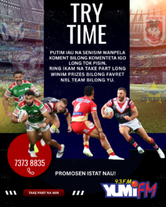 Putim eyau long YUMIFM long harim wanpela radio personality playim wanpela rekod bilong komenteta na ba yu senisim igo long tok pisin long sans bilong yu long winim merchandise bilong favret NRL team bilong yu.🥳