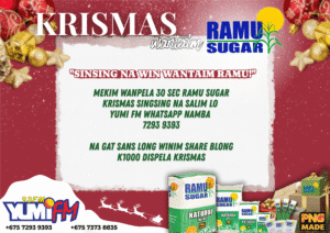 YumiFM Krismas wantaim Ramu Promosen i bai stat long Mande 1st December na pinis long 26th December. Kamap wantaim wanpela 30seconds sinsing bilong Ramu Sugar na salim ikam long whatsapp #7293 9393 long sans bilong yu long winim K1000 cash na selebratim Krismas wantaim Ramu Sugar.